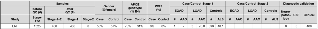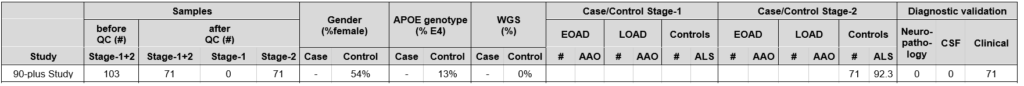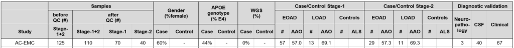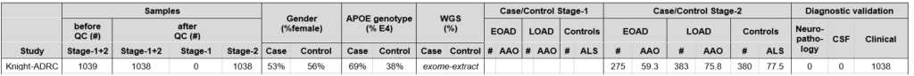 The samples were recruited at Washington University School of Medicine in Saint louis, MO. All the cases received a diagnosis of dementia of the Alzheimer's type (DAT), using criteria equivalent to the National Institute of Neurological and Communication Disorders and Stroke-Alzheimer's Disease and Related Disorders Association for probable AD. Cognitively normal participants received the same assessment as the cases, and were deemed nondemented. Prior written consent, participants are genotyped for APOE4 allele and screened for known mutation in APP, PSEN1, PSEN2, MAPT, GRN, or C9orf72 by the Clinical and Genetics Core of the Knight ADRC