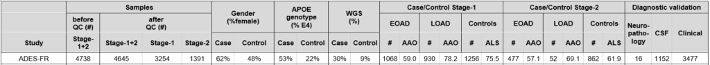 The ADES-FR project combines WES and WGS data from AD cases and controls from France. Unrelated cases with early-onset AD from France were recruited among patients who fulfilled the NIAA criteria. The clinical examination included personal medical and family history assessment, neurologic examination, neuropsychological assessment, and neuroimaging. In addition, CSF biomarkers indicative of AD were available for 67% of the cases. Patients were either screened by Sanger sequencing and QMPSF for pathogenic variants in APP, PSEN1 or PSEN2 prior to WES or by the interpretation of WES data or both.