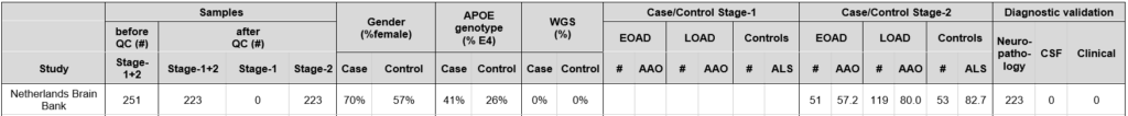From the Netherlands Brain Bank, we selected brain tissues donated by patients diagnosed with Alzheimer Disease. DNA was isolated and used for WES sequencing.
