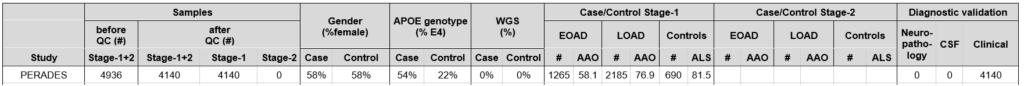 The PERADES sample comprises individuals with Alzheimer's disease and healthy controls recruited across UK, Italy and Spain. The participants were assessed at home or in research clinics along with an informant, usually a spouse, family member or close friend, who provided information about and on behalf of the individual with dementia. Established measures were used to ascertain the disease severity. Control participants were recruited from GP surgeries and by means of self-referral. For all other recruitment, all AD cases met criteria for either probable or definite AD. Control samples were chosen to match case samples for age, gender, ethnicity and country of origin.