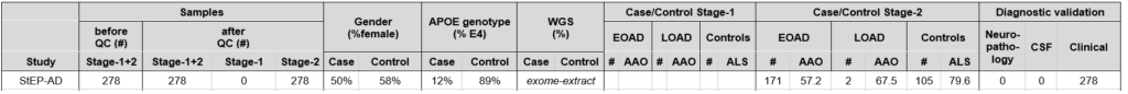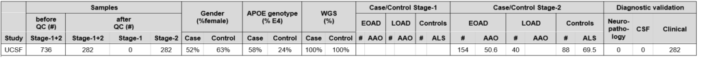 ADSP Discovery phase: Cases and controls were selected from over 30,000 non-Hispanic Caucasian subjects from multiple cohorts. All controls were greater than 60 years and were cognitively normal based on direct assessment. All cases met NINCDS-ADRDA criteria for possible, probably, or definite Alzheimer's disease. All cases had documented age-at-onset, and for those with pathologically confromed AD, an age-at death. APOE genotypes were available for all. Cases were selected to have a minimal AD risk based on sex, age and APOE genotype. Controls were selected as those with the least probability of converting to AD by age 85.